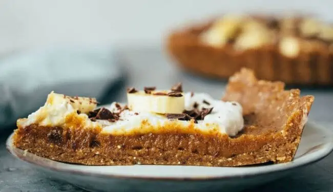 Eine herrlicher roher Banoffee Tarte (Cake) mit leckerem Boden aus Nüssen, gefolgt von einer Schicht Dattel-Toffee und getoppt mit einer dicken Schicht Kokosnusssahne.