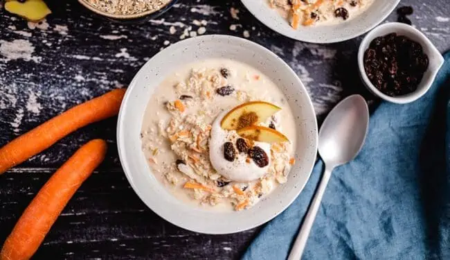 Die Zutatenliste ist wie gewohnt kurz und knackig. Haferflocken, Karotte, Apfel, Ingwer, Haferflocken, Pflanzenmilch, cremigen Joghurt oder Quark, Sonnenblumenkerne und Ahornsirup. Das war es auch schon!