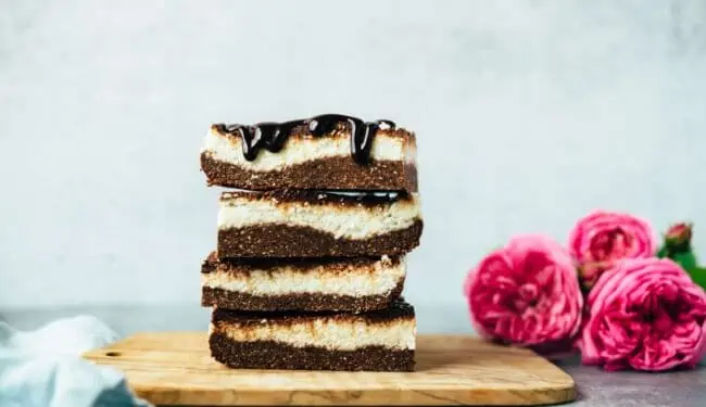 Die Bounty Schnitten bestehen aus drei einfachen Schichten, Dattel-Nuss Boden, cremige Kokosnussfüllung und zartschmelzendes Schoko-Topping.