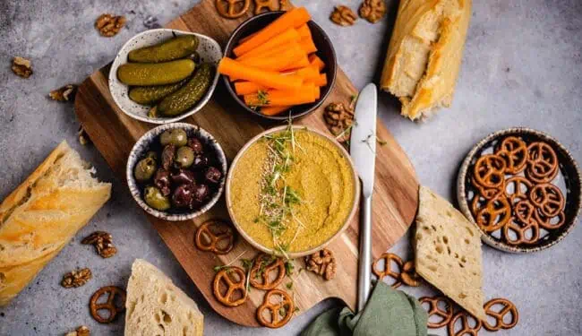 Ich mag den Aufstrich sehr gerne zu einer veganen Brotzeit. Dafür nehme ich ein schönes Holzbrett und gebe den Aufstrich zusammen mit Gemüsesticks und weiteren Snacks dazu. Ein paar Scheiben frisches Sauerteigbrot runden es perfekt ab.