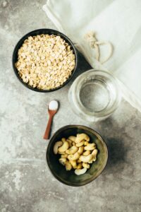 Wer immer noch Lust hast, auf diese cremige und leckere Pflanzenmilch, darf jetzt gerne dranbleiben. Es gibt noch ein paar kleine Tipps und Tricks, mit der sie auch sicher gelingt. Zunächst einmal ein paar Worte zu den Zutaten. Wasser, Haferflocken, Cashews und eine Prise Salz. Die Cashews nehme ich als eine Art Ersatz für das Öl dazu. Durch sie wird die Milch schön cremig.