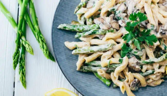 Cremige Pasta mit grünem Spargel und Champignons (30 Minuten) veganes Rezept