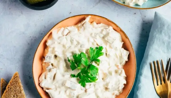 - Eine Portion Cashew Majo herstellen. Falls gekaufte Majo verwendet wird 6 gehäufte Esslöffel in eine große Schüssel geben.1 Portion Portion Cashew Majo