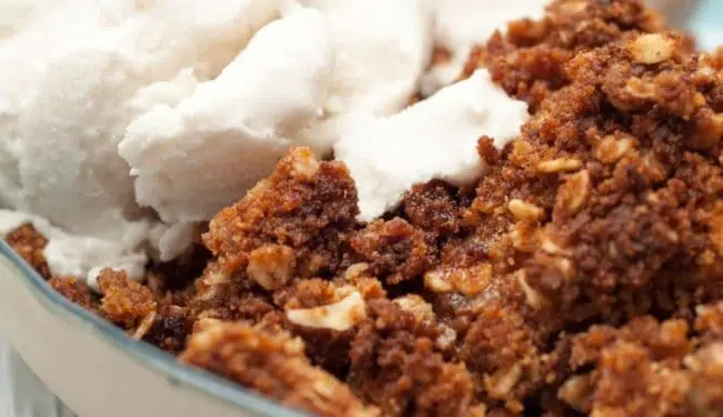 - In die gleiche Schüssel alle Zutaten für das Topping geben und gut vermischen. Über die Äpfel geben und ab in den Ofen für 50-60 Minuten. Das Crisp ist fertig wenn die Äpfel schön weich sind, die Füllung Blasen gebildet hat und die Ränder schön goldbraun sind.eine Prise Muskat, 90 g Haferflocken, 55 g Mandelmehl, 68 g glutenfreie Mehlmischung, 96 g Kokosblütenzucker Kokosblütenzucker, 110 g Rohrzucker, 50 g Pekannüsse, 1 g Meersalz, 2 g Zimt, 120 ml Kokosnussöl