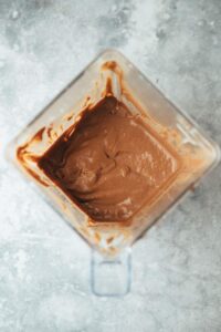 - Die etwas abgekühlte, aber flüssige Schokolade und Ahornsirup (optional Mandelmus) dazugeben und einmal auf höchster Stufe cremig mixen.100 g dunkle vegane Schokolade, 30 ml Ahornsirup, Optional: 1 EL Mandelmus, Mandelmus natur
