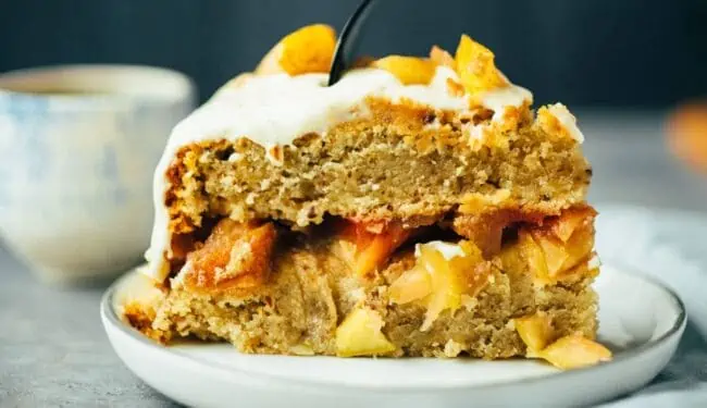 Einmal der Boden aus feinem Rührkuchen, dann eine Füllung aus karamellisierten Äpfeln und verziert mit einem feinem Frosting aus Cashews, Joghurt, Zitronensaft, Zitronenschale, Vanille, Ahornsirup und einer Prise Salz. Halt, eines habe ich vergessen! Xanthan Gum, mein Lieblings-Bindemittel in der veganen Küche. Hol Dir unbedingt eine Packung davon. Es handelt sich um ein natürliches Bakterium, das auch in kalten Gerichten eine super Bindung erzeugt. Ich habe Dir mein Lieblingsprodukt unten in den Zutaten verlinkt.