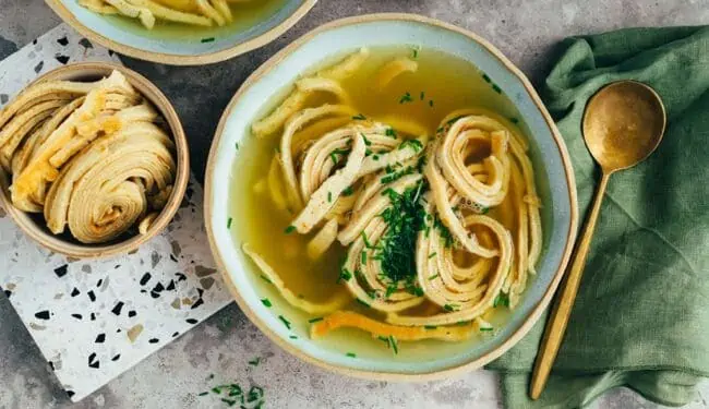 - Sobald die Brühe heiß ist, kalte Pfannkuchen aufrollen und in feine Streifen schneiden.