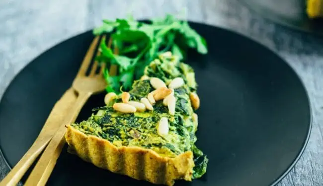 - 30 Minuten backen und aus dem Ofen nehmen. Die Quiche ist fertig, wenn die oben und an den Seiten goldbraun gebacken ist. Die Pinienkerne sollten ebenso schön gebräunt sein.