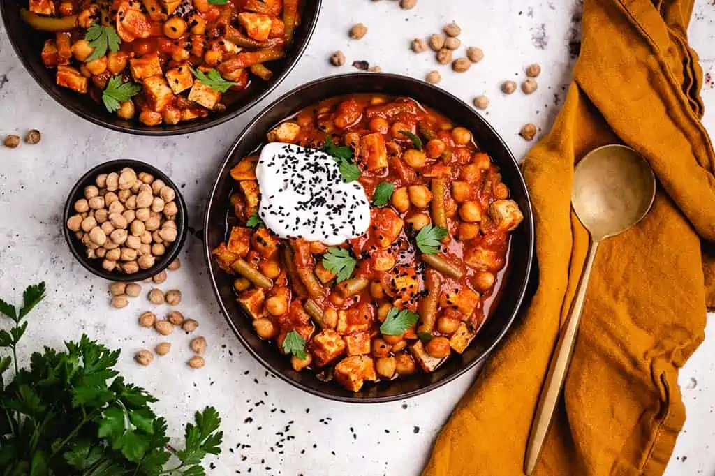 Dieser einfache Eintopf besteht aus wenigen Schritten und erfordert keine besonderen Kochkenntnisse. Zunächst gebe ich etwas Olivenöl in die Pfanne und erhitze es. Dazu kommt eine rote Zwiebel, Knoblauch und der gewürfelte Tofu. Das wird alles zusammen kurz angebraten, bis die Zwiebel leicht glasig und schön gebräunt sind. Weiter geht’s mit den Gewürzen Kreuzkümmel und Paprika, Tomatenmark, Kichererbsen, Tomaten Passata, grüne Bohnen, Harissa Paste, Ahornsirup, Tamari und Zitronensaft. Jetzt fehlt nur noch ein klein wenig Wasser zum Ablöschen, Deckel darauf und schon darf unser herzhafter Eintopf köcheln.