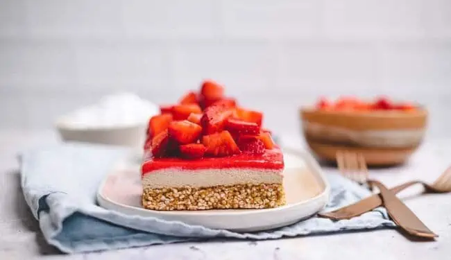 Feine vegane Erdbeerschnitten mit einer cremigen Schicht aus Cashews und Quark auf einem Boden aus gepufften Quinoa. Getoppt mit einer fruchtigen Schicht aus Erdbeeren, geliert mit Agar-Agar. Ideal als Nachspeise oder zum veganen Kaffeekränzchen.