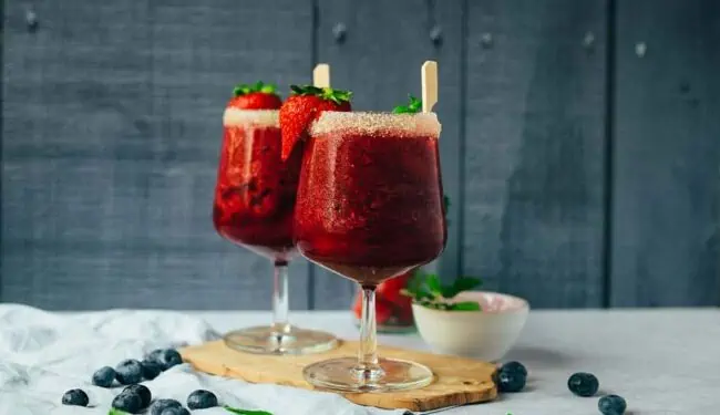 - Falls der Slushie als Cocktail serviert werden soll, etwas Rohrohrzucker in eine Schüssel geben, Gläserränder anfeuchten und in den Zucker drücken.