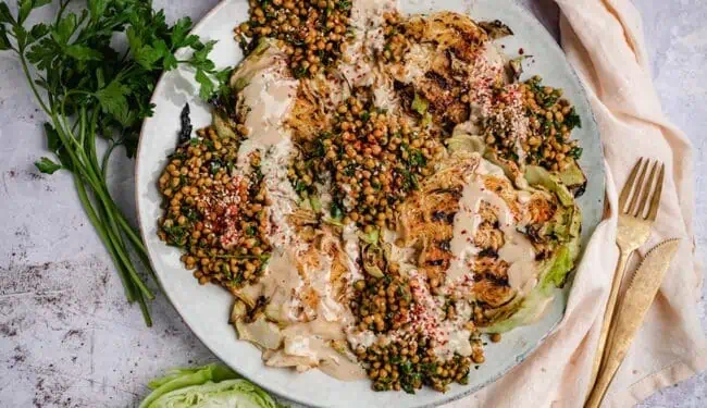 Gegrillte Weißkohl Steaks mit Chimichurri Linsen