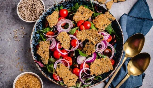 Gemischter Salat mit Crackern, oder habe ich schon erwähnt, dass ich Salate liebe? Momentan habe ich eine Phase, in der ich super gerne Salate mache. Dabei darf es auf keinen Fall langweilig werden. Ich muss immer schmunzeln, wenn ich auf Instagram Bilder sehe mit Salaten, die Veganer und normale Esser machen. Die Salate der Veganer sind voll mit unterschiedlichen Inhaltsstoffen und verziert mit den tollsten Extras. Die der normalen Esser bestehen meist aus einer Schüssel mit grünem Salat, ein paar Tomaten und Dressing. Das war’s. Bitte entschuldige an dieser Stelle den Begriff „normaler Esser“, aber ich weiß wirklich nicht, wie ich das sonst beschreiben soll. Vielleicht fällt dir ja was besseres ein? Dann kommentiere gerne ganz unten auf der Seite.