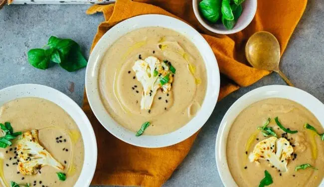 Cremige vegane, geröstete Blumenkohlsuppe