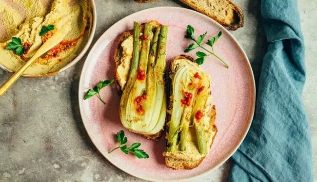 - Brotscheiben nach Belieben mit Hummus einstreichen und die geschmorten Fenchelhälften darauf platzieren.Salz nach Belieben, Eine Portion Hummus classic, Baguette, Frische Zitronenscheiben