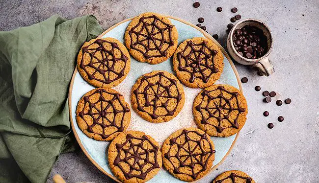 - Schokolade vorsichtig über dem Wasserbad schmelzen und in eine Spritzflasche geben. Kekse mit einem Spinnennetz Muster verzieren, abkühlen lassen und genießen! Reste luftdicht verschlossen bis zu 4 Tage aufbewahren.90 g dunkle vegane Schokolade