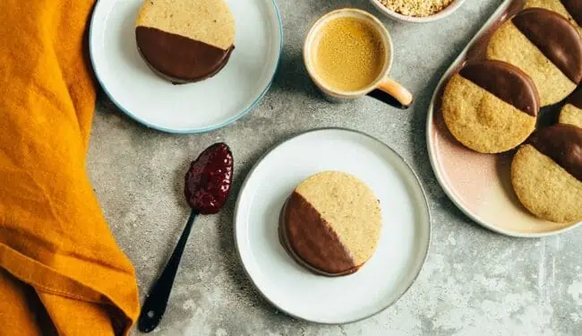 Haselnusstaler mit Marmeladenfüllung, in Schokolade getaucht. Was könnte man sich Schöneres vorstellen? Ich bin auf jeden Fall begeistert, wie von so vielen weihnachtlichen Gebäckvariationen, die momentan auf der Tagesordnung stehen. Es macht mir eine große Freude, den Plan für die Weihnachtsrezepte zusammenzustellen. Warum? Weil alles weihnachtlich gewürzt ist und die Küche nach den herrlichen Düften riecht. Der Kaffee am Nachmittag ist dann das Highlight des Tages, am besten mit einem feinen, veganen Keks. Genauso einen backen wir heute zusammen. Bereit?