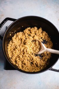 TIPP: Hirse kann beim Kochen etwas bitter werden. Das liegt an den kleinen Fettteilchen, die auf der Hirse sitzen. Am besten wäscht du die Hirse einmal mit heißem Wasser und braust sie anschließend noch einmal kalt ab vor der Verarbeitung, um das Fett zu entfernen.