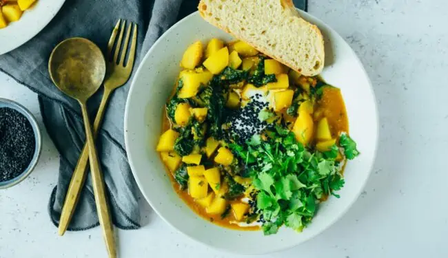 Was passt du diesem indisch gewürzten Stir Fry? Besonders lecker zu diesem Eintopf schmeckt frisch gebackenes Naan, Baguette oder Reis.