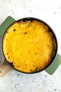 - Über der Bohnen-Jackfruit Mischung verteilen und glattstreichen. Mit einer Gabel Muster nach Belieben hineinziehen.