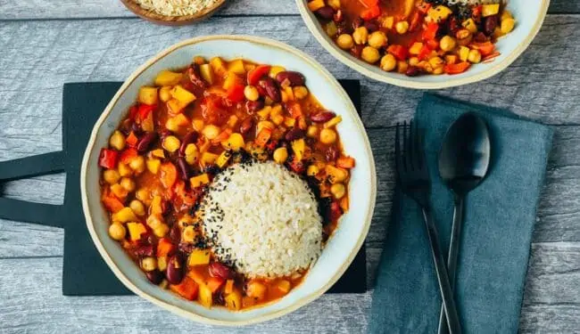 Das Gericht besteht also aus Reis, Gemüse, Gewürzen, Chili und einer proteinhaltigen Einlage. Hier greife ich sehr gerne auf Hülsenfrüchte zurück und habe mich für Kichererbsen und Kidneybohnen entschieden. Man könnte aber genauso gut schwarze Bohnen oder Borlotti Bohnen verwenden.