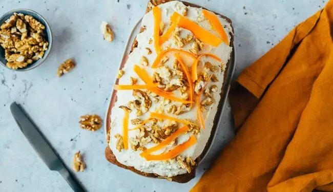 - Cashew-Frosting über dem Karottenkuchen verteilen, mit Walnüssen garnieren und in Stücke schneiden. Genießen!⅓ Tasse Walnüsse als Topping, Mehr Walnüsse