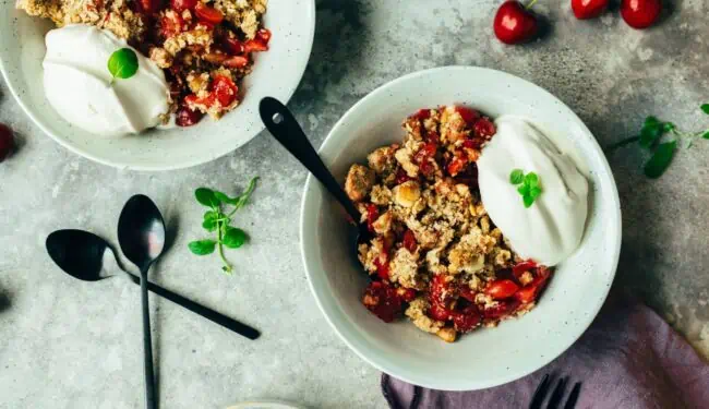Leckere Nachspeise mit saftigen Kirschen und feinem Hafer-Nuss Crumble