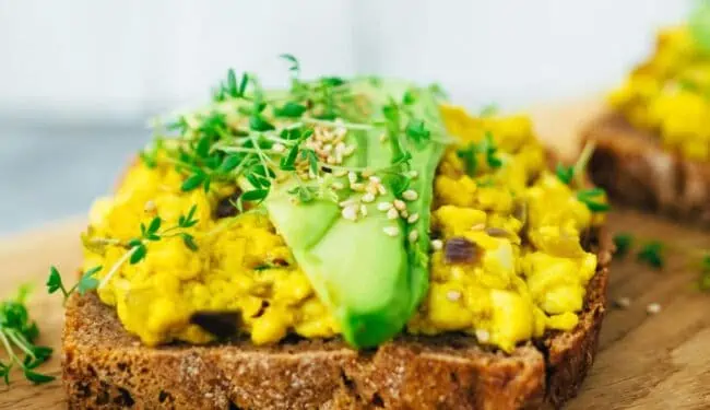 Die Zutaten sind überschaubar, mit Seidentofu, Zwiebel, Kurkuma, Knoblauchgranulat oder frischen Knoblauch, Nährhefe, Tamari und einer Prise Meersalz. Das Ganze wird dann auf einer Scheibe Sauerteigbrot serviert, getoppt mit Avocado, Sprossen und Sesam.