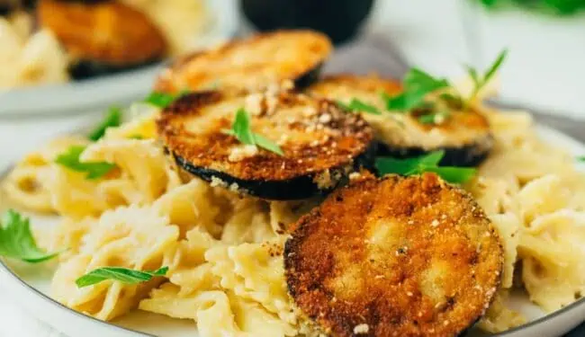 Knusprig panierte Aubergine mit cremiger Pasta (30 Minuten)