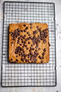 Vielleicht fragst du dich gerade, was Blondies eigentlich sind. Brownies kennt ja jeder und ich denke, dass du vielleicht auch ein großer Fan davon bist. Blondies sind, wie der Name schon vermuten lässt, die helle Variante eines Brownies, ohne Kakao oder Schokolade. In unserem Fall kommt eben noch Kürbispüree dazu und die Leckereien bekommen eine schöne, leicht orange-gelbliche Farbe. Da ich nicht ganz auf Schokolade verzichten wollte, habe ich mich für ein Schoko-Drops Topping entschieden.