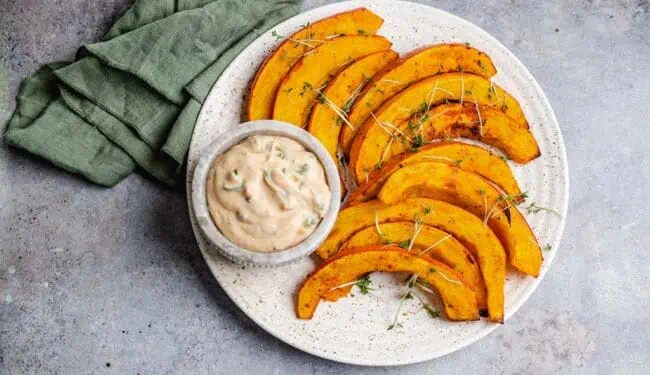 - Kürbisspalten auf einer Platte anrichten und zusammen mit dem Dip servieren.Frische Küchenkresse oder andere Kräuter nach Wahl