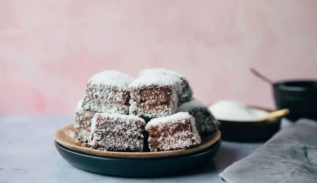 - Teig aus der Form nehmen und in 24 gleiche Quadrate schneiden. Je nach Belieben kann man die Lamingtons auch größer machen und nur 12 Quadrate schneiden.