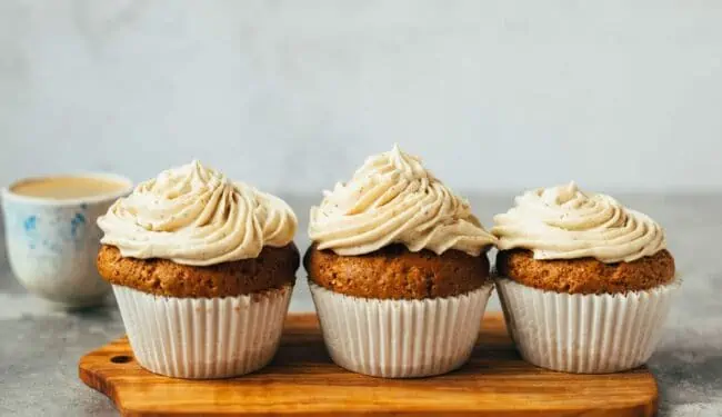 - FÜR DAS FROSTING alle Zutaten in einen Mixer geben (oder einen Handmixer verwenden) und so lange mixen, bis eine feine Creme entstanden ist.312 g Bio-Puderzucker, 80 ml Ahornsirup, 1 TL Lebkuchengewürz *, 1 TL Bourbon Vanille gemahlen, 1 Prise Salz, 227 g vegane Margarine