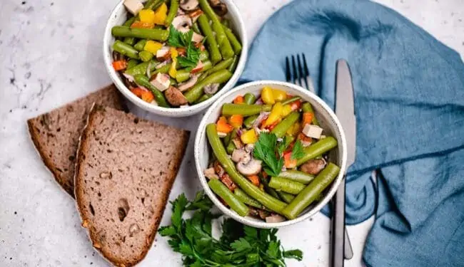 Mediterraner Bohnen Salat aus grünen Bohnen ist momentan eine meiner liebsten Beilagen. Letztens war ich wieder bei meinem Lieblings-Gemüsehändler und da sah ich diese wunderbaren grünen Bohnen. Schnell stellte ich mir die Frage, was ich damit anfangen soll? Natürlich kann man klassische gedämpfte grüne Bohnen machen, aber das ist ja auch irgendwie langweilig. Dann kam mir die Idee einen leckeren Bohnen Salat daraus zu zaubern. Mediterran gewürzt mit Champignons, Paprika und eingelegt in einem leckeren Sud. Na, Lust bekommen? Dann lass uns zusammen loslegen.