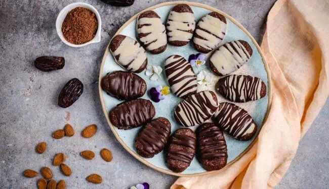 - FÜR DIE EIER Mandeln in einen Mixer geben und zu einem feinen Mehl mahlen. Medjool Datteln, Kakaopulver und Salz dazu geben und noch einmal mixen, bis sich alles gut verbunden hat. So lange mixen, bis ein gleichmäßiger, kompakter Teig entstanden ist. In eine Schüssel geben und für 20 Minuten in den Kühlschrank stellen, so lässt sich der Teig einfacher verarbeiten.288 g Medjool Datteln, 200 g Mandeln, 15 g Kakaopulver, eine Prise Salz