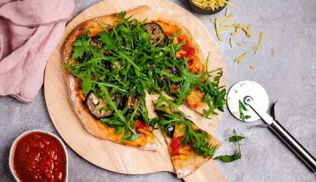 Pizza mit gegrillter Aubergine und Rucola