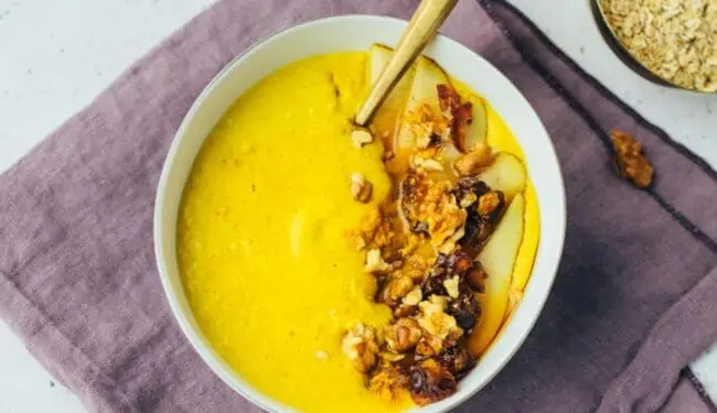 Haferflocken, Mandelmilch, Kurkuma, Zimt, Ingwer, Kardamom, eine Prise Pfeffer, Ahornsirup, (optional) Datteln, Walnüsse und Birnen. Soweit zu unserer heutigen Zutatenliste. Stellt sich nur noch die Frage, was Kurkuma nun wirklich kann? Ist es einfach nur ein Gewürz, oder hat es tatsächlich die gesundheitsfördernden Eigenschaften, die immer wieder in den Medien angepriesen werden? Ich habe mich für Dich schlau gemacht. Kurkuma wird das Gewürz genannt, der enthaltene Farbstoff Curcumin. Dieser soll nach neuesten wissenschaftlichen Erkenntnissen:
