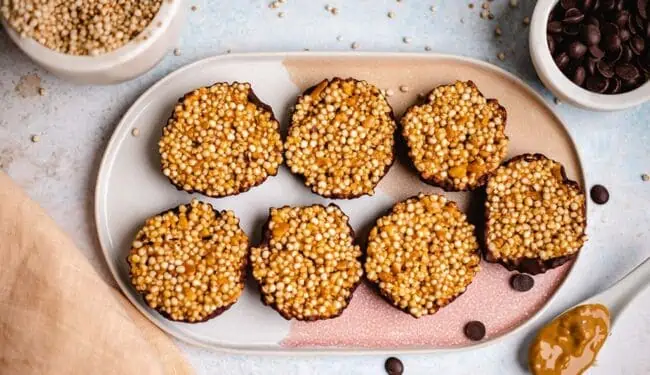 Unser heutiger Snack könnte wirklich nicht einfacher sein. Gepuffter Quinoa, Ahornsirup, Erdnussbutter und Bourbon Vanille. Das wird alles zu einer feinen Maße verarbeitet und in Muffin Förmchen gepresst. Dann geht es auch gleich ab in den Gefrierschrank und in der Zwischenzeit wird die Schokolade geschmolzen. Zum Schluss noch hineindippen und Schokolade fest werden lassen. Kling einfach? Ist es auch.