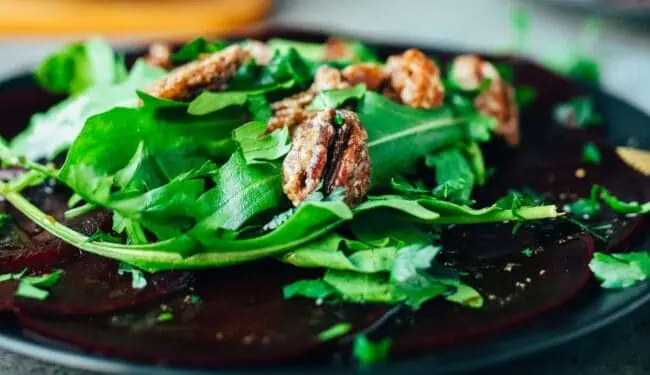 Einmal in Scheiben geschnitten und auf dem Teller platziert, wird das Carpaccio mit einer feinen Balsamico Vinaigrette verfeinert. Dann noch Rucola oben draufgeben und mit gebrannten Pekannüssen verfeinern. Das war’s auch schon.