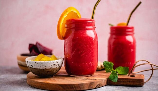 Werfen wir einen genauen Blick auf den heutigen Smoothie und die Inhaltsstoffe. Gefrorene Mango, Himbeeren, Orange, rote Bete, Minze, Ingwer und Wasser. Das alles kommt in einen Hochleitungsmixer und wird zu einem cremigen Smoothie verarbeitet. Das einzige was noch nicht ganz ideal für viele sein könnte, ist die Süße. Deshalb habe ich mir noch einige gesunde Süßungs-Optionen einfallen lassen, die du ganze einfach integrieren kannst. Datteln, Ahornsirup oder eine gefrorene Banane.