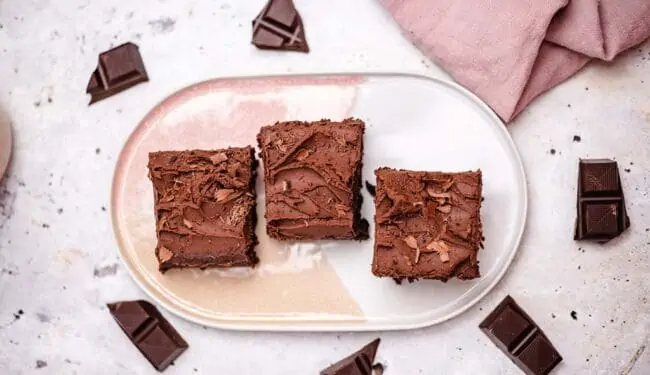 Die Zutatenliste ist wie gewohnt kurz und überschaubar. Glutenfreie Mehlmischung, Hafermehl, Rohrohrzucker, Kakaopulver, Bourbon Vanille, Backpulver, Natron, Salz, geschmolzene Schokolade, Apfelmark, Ahornsirup, ein Shot Espresso und Pflanzenmilch. Das wird alles zu einem glatten Teig verarbeiten und für 40 Minuten gebacken. Ich verwende eine rechteckige Form mit dem Maßen 24×24 Zentimeter.