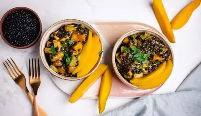 Salat mit Beluga Linsen, Avocado und Mango für alle, die Lust auf einen exotischen Salat haben. Als der Postbote letztes Mal an der Türe geklingelt hat, wurde ein großes Paket geliefert mit einigen Kilos an Mangos und Avocados. Ich habe mich gleich hingesetzt und recherchiert nach feinen Rezepten, die ich damit kreieren kann. Dann kam mir die Idee einen Salat zu machen, den ich damals auf dem Bali Vegan Festival gegessen habe. Mit feiner Mango, Avocado und Beluga Linsen. Los geht’s!