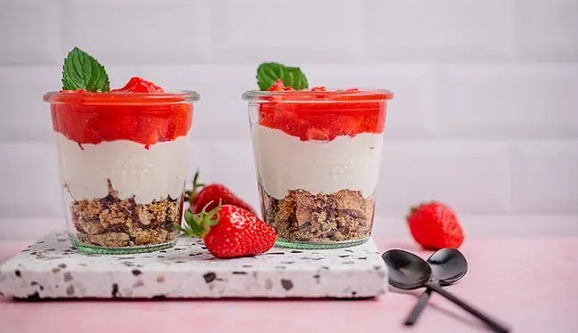 Veganes Erdbeer-Dessert mit veganem Quark, Ahornsirup und veganen glutenfreien Keksen ist nicht nur ein leckeres und erfrischendes Dessert, sondern auch eine gesunde Wahl für diejenigen, die eine pflanzliche Ernährung bevorzugen oder sich für eine gesunde Lebensweise entschieden haben.