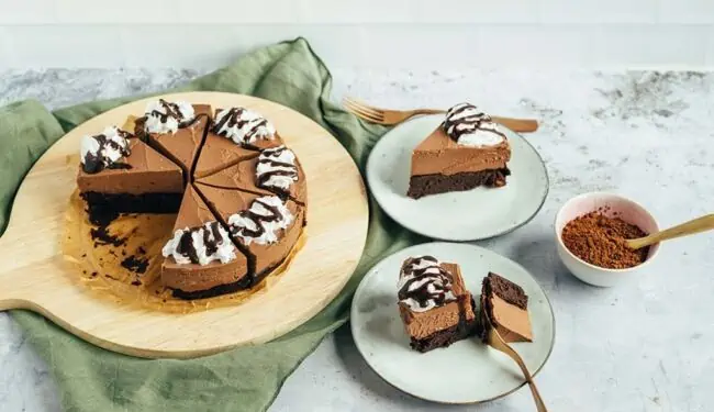 - Kurz vor dem Servieren aus dem Kühlschrank nehmen, in Stücke schneiden und mit Toppings nach Wahl garnieren und genießen!