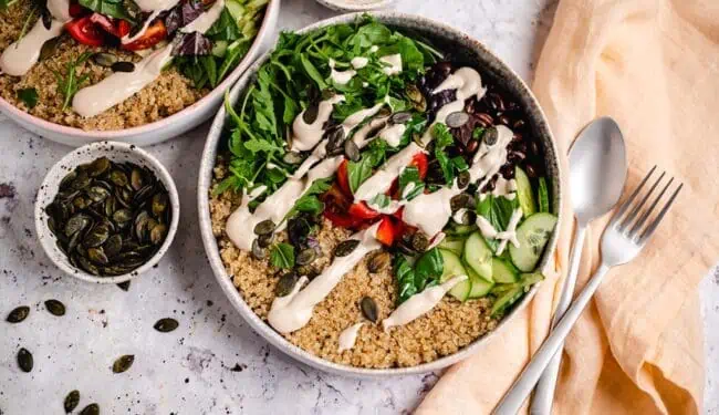 Unsere Bowl besteht im Wesentlichen aus zwei Komponenten. Das Gemüse, der Quinoa, schwarze Bohnen und ein Salat nach Wahl bildet die Basis. Dazu kommt ein leckeres Dressing mit Tahini, das richtig schön cremig und super aromatisch ist. Als Topping verwende ich Kürbiskerne oder auch mal gerne Sesamsamen. Das entscheide ich je nach Lust und Laune.
