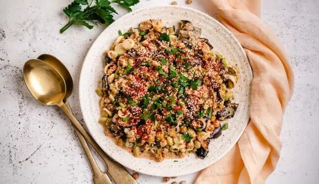 - Eine große Salatschüssel bereitstellen, geröstete Aubergine und Kichererbsen, Dressing, Frühlingszwiebel, Edamame, Sesamkörner und Chiliflocken dazugeben. Gut durchmischen, bis alles gleichmäßig verbunden ist und mindestens 4 Stunden, aber am besten über Nacht kühlstellen und durchziehen lassen. Kurz vor dem Servieren mit frischer Petersilie bestreuen und genießen!