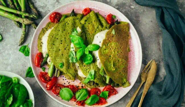 Spinat Crêpes mit Mozzarella und grünem Spargel (glutenfrei)