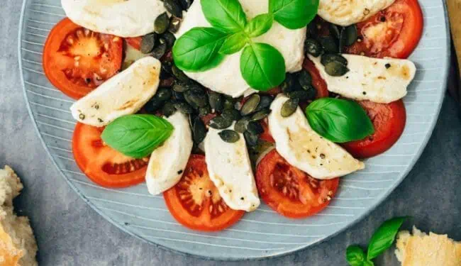 Sommerlich leichtes, sehr leckeres Gericht, das sowohl Vor-, als auch Hauptspeise sein kann. Hausgemachter Cashew-Mozzarella trifft auf perfekt reife Tomaten. Abgerundet wird die Caprese mit einem Balsamico Dressing, leckerem Basilikum und Kürbiskernen.