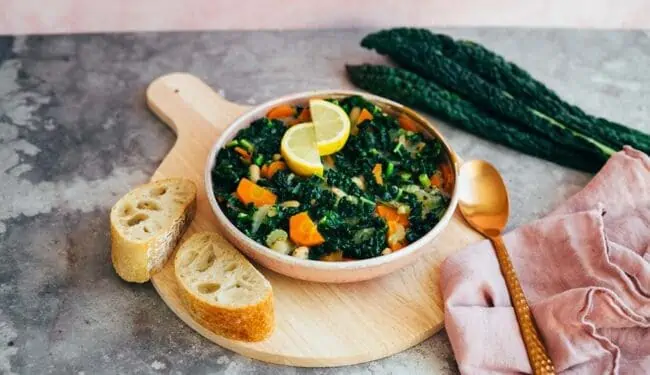 Los geht es mit den Inhaltsstoffen. Etwas Bratöl, Knoblauch, Zwiebel, Sellerie, Karotten und weiße Bohnen, abgelöscht mit Gemüsebrühe und gewürzt mit italienischen Kräutern, Meersalz und Pfeffer. Kurz vor Ablauf der Kochzeit gebe ich noch Schwarzkohl dazu, für einen extra Nährstoff Kick. Alternativ eignet sich auch gewöhnlicher Grünkohl.