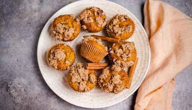 vegane Kürbis Muffins mit gesunden Streusel. Fluffig, weich, kürbis-sig und natürlich süß. Perfekt für das herbstliche Frühstück, Kaffeekränzchen oder einfach so als Snack.